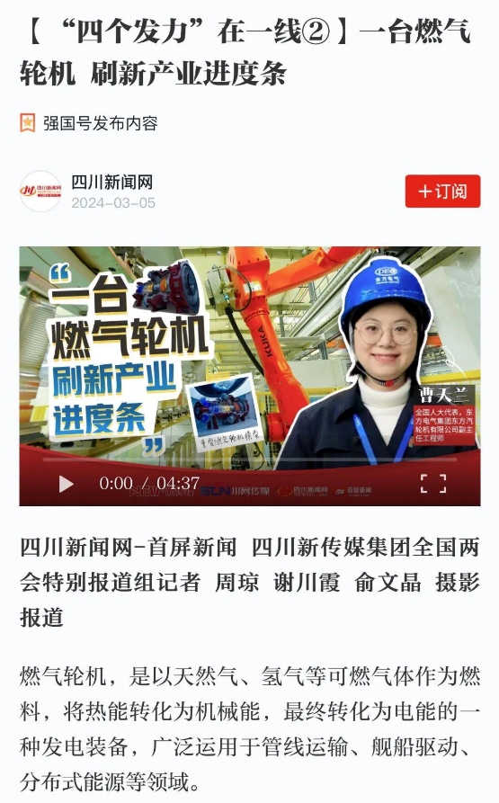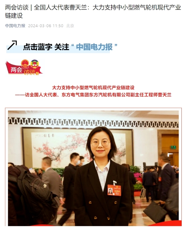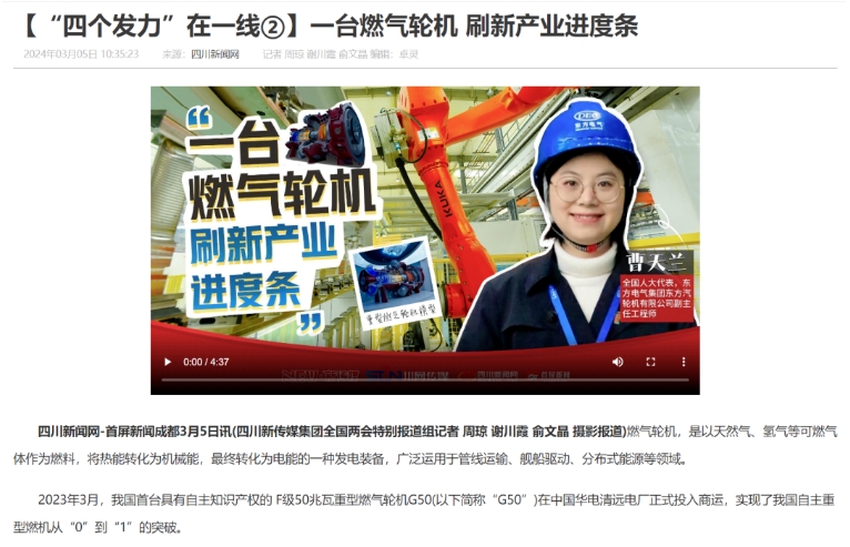 2024全国两会正在进行时,十四届全国人大代表、东方电气集团东方汽轮机有限公司数字化与智能制造部副主任工程师曹天兰,带着“中小型燃气轮机现代产业链建设”和“加快制造业‘智改数转’高质量建设成渝地区高端装备产业集群”的建议参加会议。