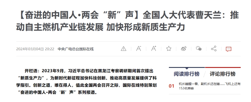 【奋进的中国人·两会“新”声】推动自主燃机产业链发展 加快形成新质生产力