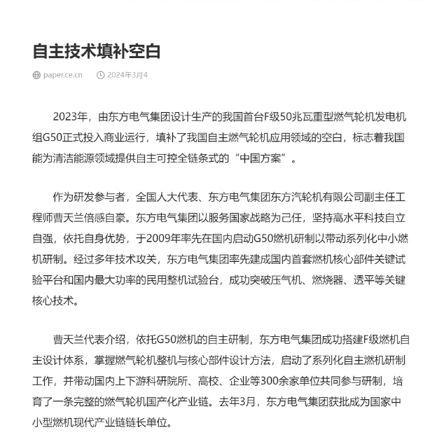 “打好关键核心技术攻坚战,习近平总书记给我们进一步指明了创新攻关的方向。”全国人大代表、东方电气集团东方汽轮机有限公司副主任工程师曹天兰感触颇深:科技创新是原动力,去年,企业自主研制的F级50兆瓦重型燃气轮机已投入商用。在她看来,发展新质生产力,就要在具有领先优势的领域,专注突破关键核心技术难题,实现从“0”到“1”、从无到有的转变。目前,东方汽轮机正向15兆瓦燃气轮机发起冲击,争取早日“上新”。