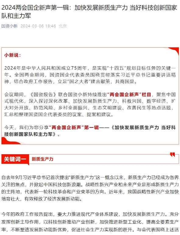 2024两会国企新声第一辑:加快发展新质生产力 当好科技创新国家队和主力军